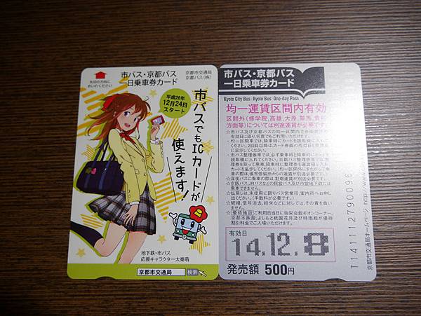 但公車不比飛機、火車、HARUKA、嵐電、地鐵..還有一些官方網站可以讓你先看做功課,公車路線圖看幾百遍有看都沒懂,心裡總是沒這麼踏實,所以搭公車被原PO視為這趟旅程中最困難的任務(先說~公車原PO到現在還是一知半解,說明的不夠清楚還請諸位去估狗神人說明);按照先前網路上找的資料,公車站牌後面都有寫這是往哪個方向&預計會經過哪些站點,要前往金閣寺可以搭12,59,101,102,204,205 在金閣寺道下車;出了嵐電車站後,左看看右找找,有喵到類似公車站牌的地方,在出了北野白梅町車站出口的左手邊,往公車站牌後面一看....水~~~都是漢字...我都看得懂耶,看起來就是這裡了,方向應該也對,等不到10分鐘,204公車進站了,公車窗戶旁邊還有顯示幕顯示著往金閣寺道,更加深了原PO的信心,馬上就跳上車去了....果然好像真的不難耶,第一次搭公車就上手~YA~~(灑花),不到10分鐘的時間,車上顯示幕顯示下一站金閣寺道,下車的方式跟台灣一樣,車體窗戶旁邊都有按鈕,用按的,不過這一站似乎很熱門,不用我們按,一堆人要在這邊下,下車時要從前門,下車前跟司機說One Day Pass,給他500日元,他會給你下圖這張票卡,刷過車上票卡機,就可以下車了,這張票卡要妥善收好,今天接下來一整天就靠這張吃飯了....