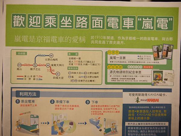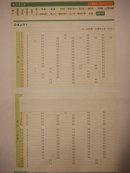 昨天晚上早早休息,今天早上06:00起床,記得帶上ICOCA &夢館預約單,07:00出門步行前往嵐電四條大宮站(住宿篇已經提過,在出飯店右手邊兩個路口),下面兩張圖片是從嵐電官方網站下載下來的指南,第一張是路線圖及嵐山景點介紹,從路線圖可以清楚看到嵐電的路線也非常簡單,左起嵐山右至四條大宮,中間可以在帷子ノ辻轉車前往北野白梅町(前往金閣寺)。第二張則是時刻表,不難讀分成平日跟假日,縱軸是時,橫軸是分,舉例往嵐山的平日第一班列車是06:00,第二班是06:14...依此類推。