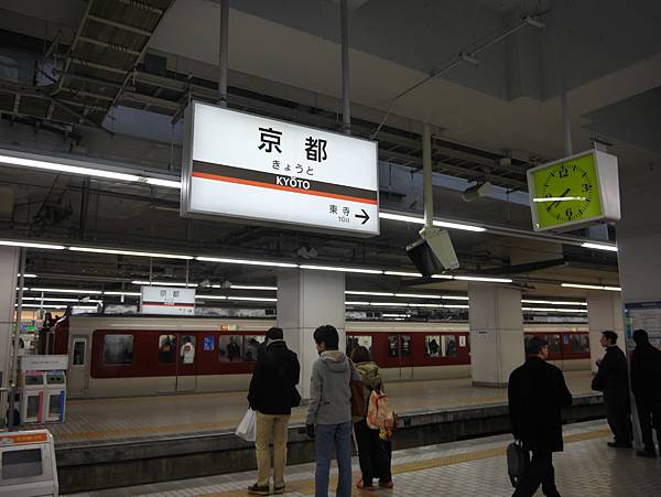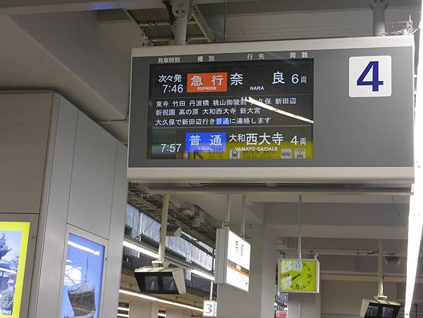 首先搭乘地鐵到京都車站,因為京都車站非常大,所以大家要花點耐心尋找一下近鐵鐵道的月台,車站指示都還算清楚,只是要花點時間走點路找一下....近鐵鐵道的月台位於京都車站的二樓,月台上的車站看板如下,看到有往奈良的車就是找對地方了....