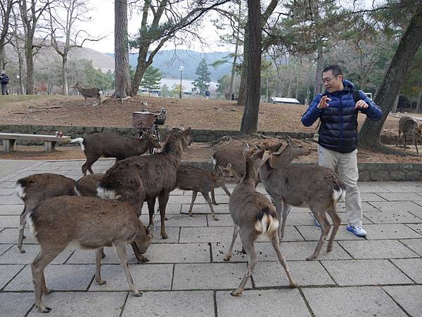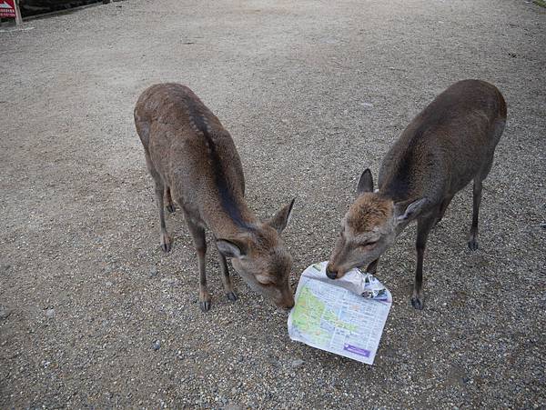 跟著導覽圖一路由春日大社的表參道往外面走,我們來到了東大寺外面,這附近很明顯的鹿群就變多了,原PO好奇的買了鹿仙貝來餵餵看,想看看會發生什麼事....