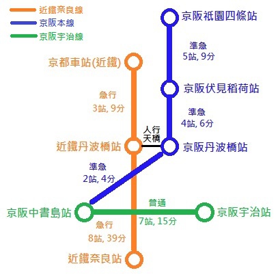 今天預計先用ICOCA搭地鐵到京都車站,從京都車站出發,搭乘近鐵奈良線(橘)前往奈良,回程在近鐵丹波橋走人行天橋到京阪丹波橋(黑),再從京阪丹波橋搭車至中書島(藍)轉車到宇治(綠);回程循相同路徑回到京阪丹波橋後,繼續北上到伏見稻荷(藍),結束伏見稻荷行程後,直接繼續北上至祇園四條站(藍)下車,步行河原町吃晚飯,再步行回飯店。