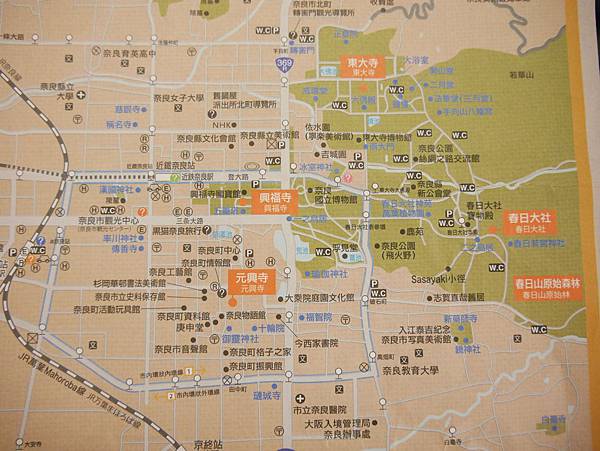 一日卷除了特急不能搭之外,其他車種都可以搭乘,所以今天選擇07:46往奈良的急行車種,約莫50分鐘左右的車程,我們就到了近鐵奈良站,車站的出口有很多旅遊導覽可以拿,下面的第一張圖可以看到近鐵奈良站出來的右手邊那一整片綠色的,就是今天要去的奈良公園,第二張圖是巴士路線圖及巴士站,從圖上可以看到巴士站就在奈良車站的對面,今天奈良公園的規劃是搭車到最裡面的春日大社本殿,再一路步行逛出來,所以出站之後到8號位置搭乘70號公車前往,下車時把一日卷遞給司機看即可,不需再付公車錢
